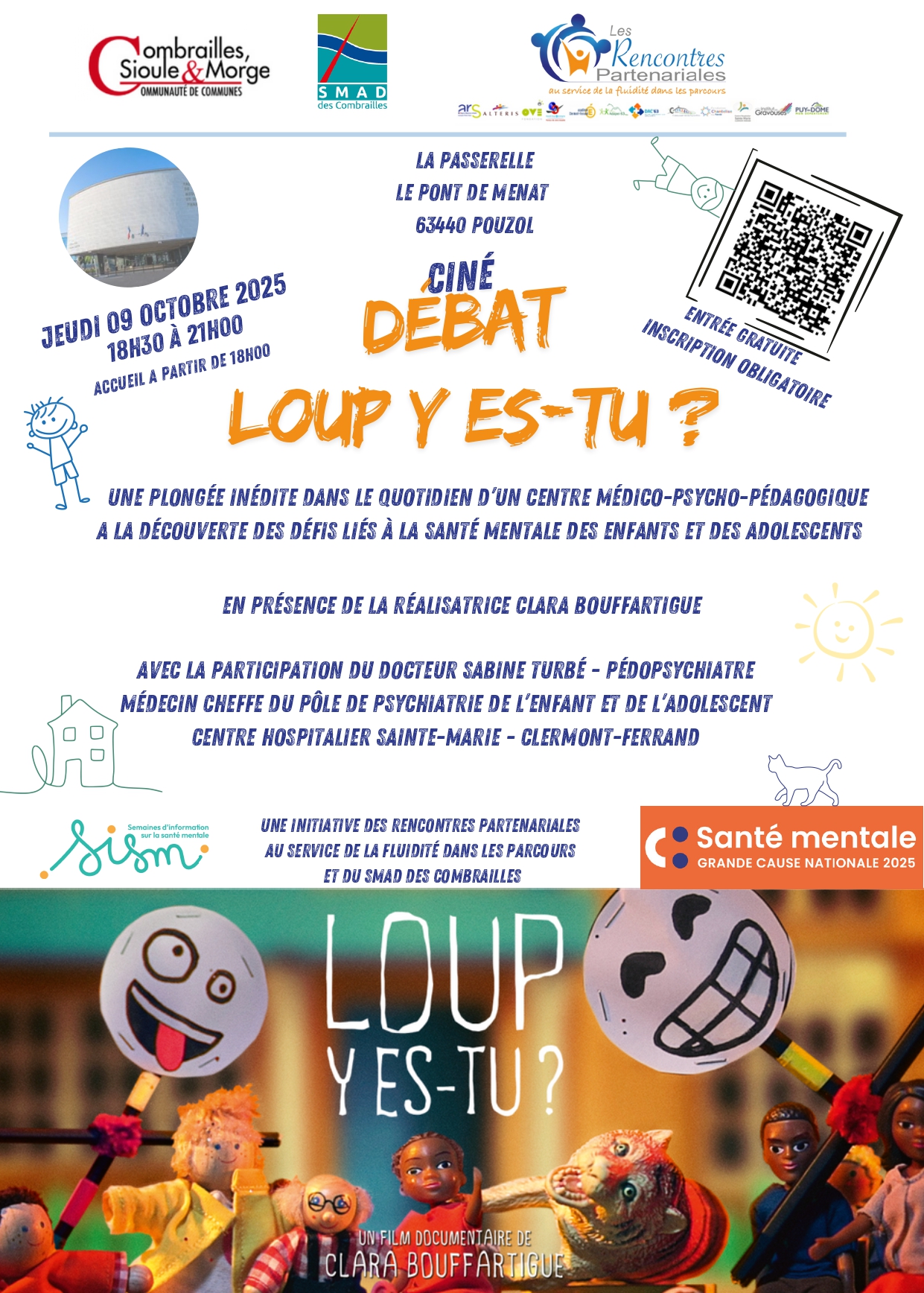 Dans le cadre des Semaines d’Information Santé Mentale qui se dérouleront du 6 au 19 octobre 2025, différents partenaires en lien avec le SMADC organisent un ciné débat intitulé « Loup y es-tu ? » le jeudi 9 octobre 2025 à partir de 17h15 à la Passerelle à Pouzol.
