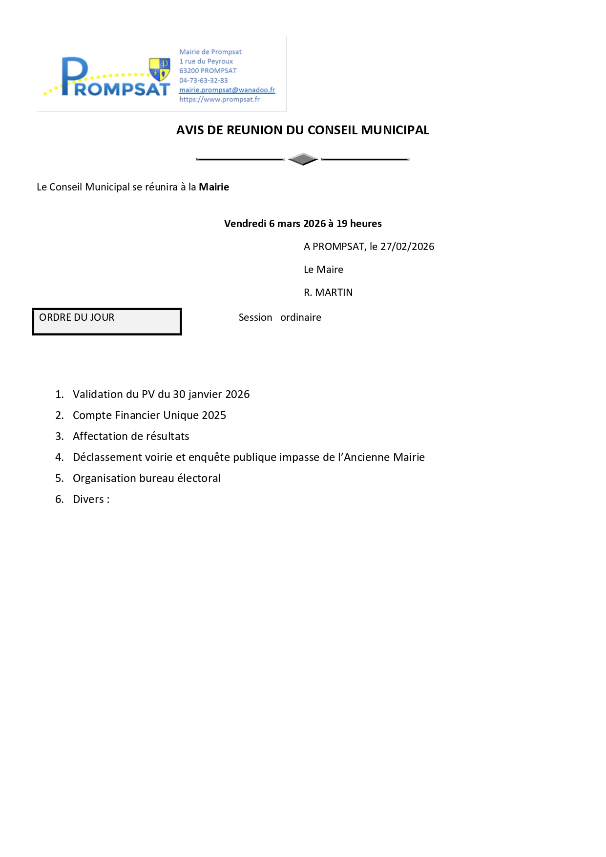 avis de conseil municipal du 6 mars 2026