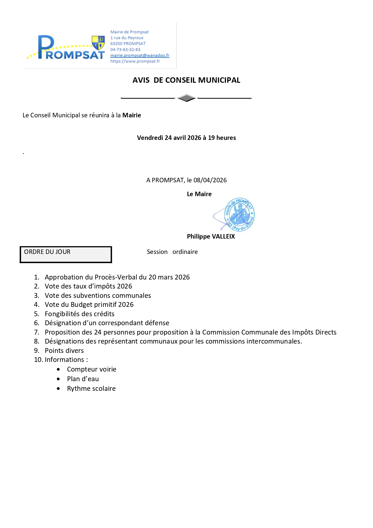 avis de conseil municipal du 24 avril 2026